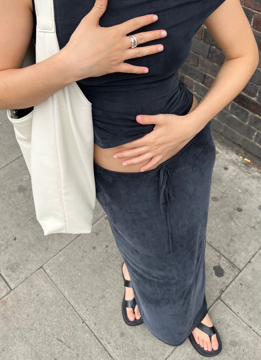 A silky-soft midi skirt made from lightweight Cupro, featuring an adjustable drawstring waist and back slit for easy movement and all-day comfort.