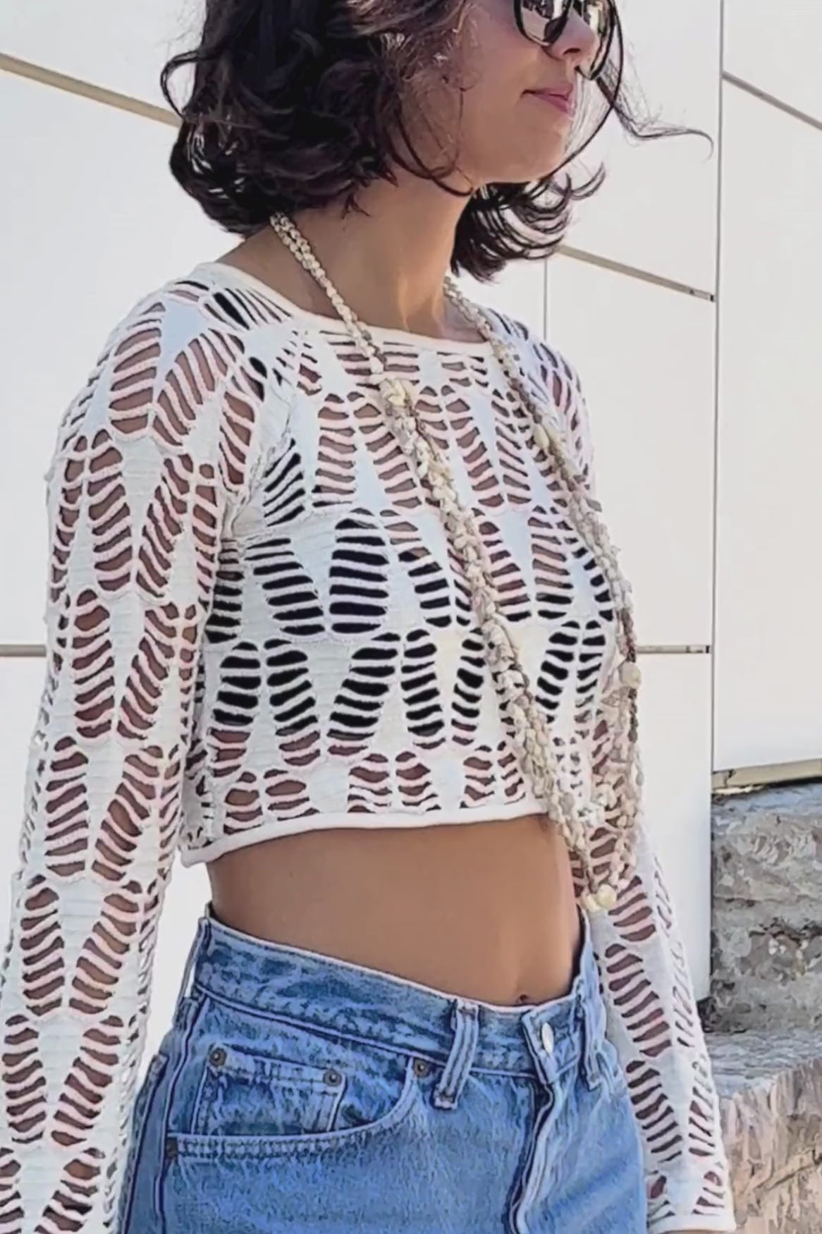 A real eye-catcher crafted from 100% organic cotton in a breezy crochet hollow knit fabric. With long sleeves and a cropped cut.