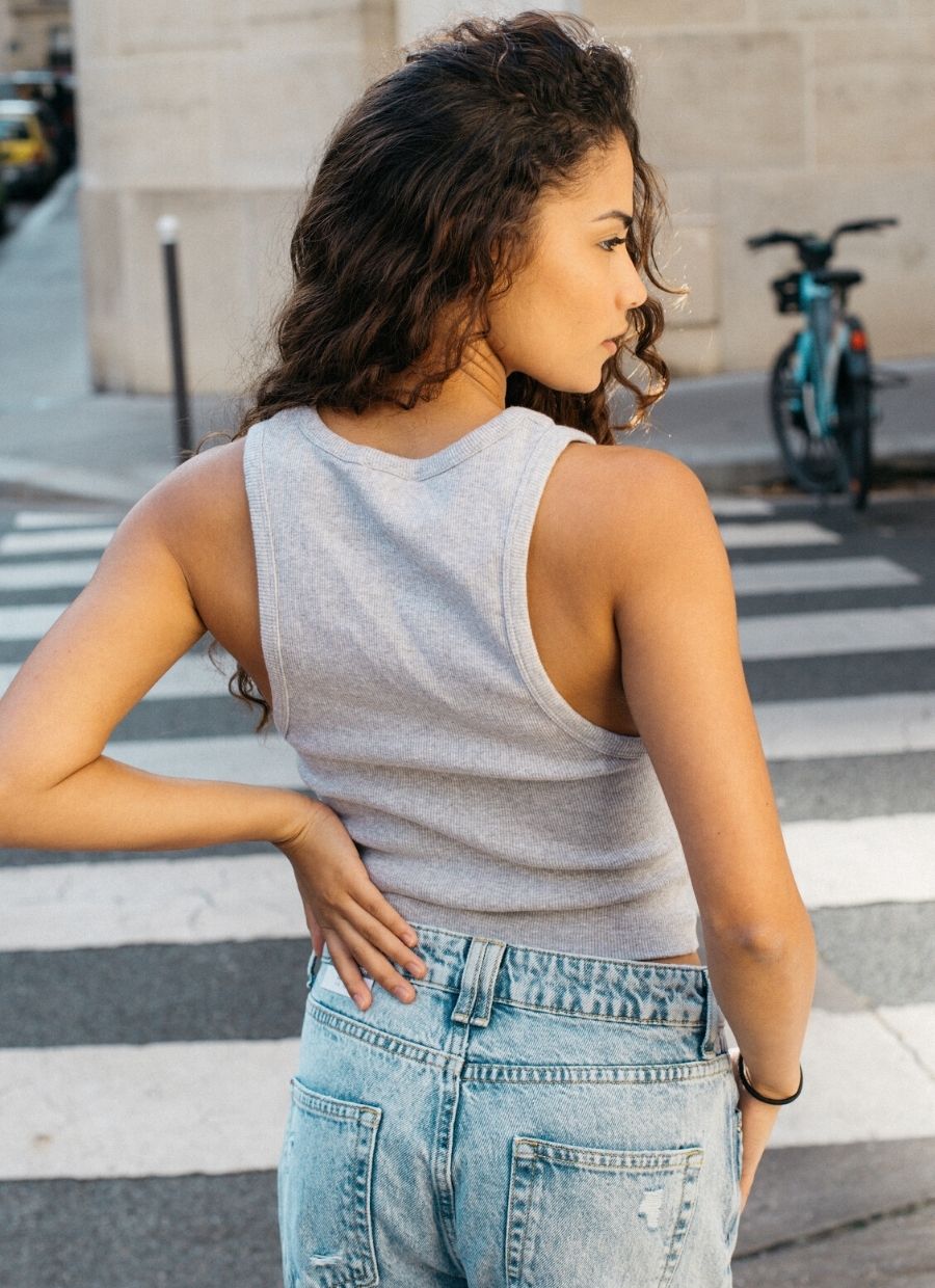 A chic, bra-friendly cropped tank in a classic grey melange. Its trendy crew neckline merges comfort with style.